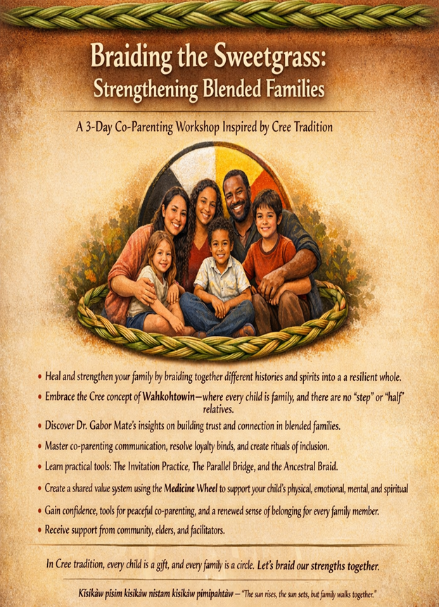 Braiding the sweetgrass is a 3 day workshop add on specifically for blended families. This add on dives into the concept of Wahkohtowin - where every child is family, there are no “step or “half” relatives. Gain confidence in peaceful co-parenting as we braid our strengths together.