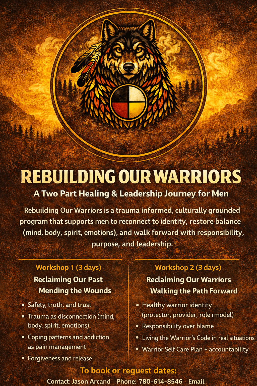 Rebuilding Our Warriors is a trauma‑informed, culturally grounded program that supports men to reconnect to identity, restore balance (mind, body, spirit, emotions), and walk forward with responsibility, purpose, and leadership.